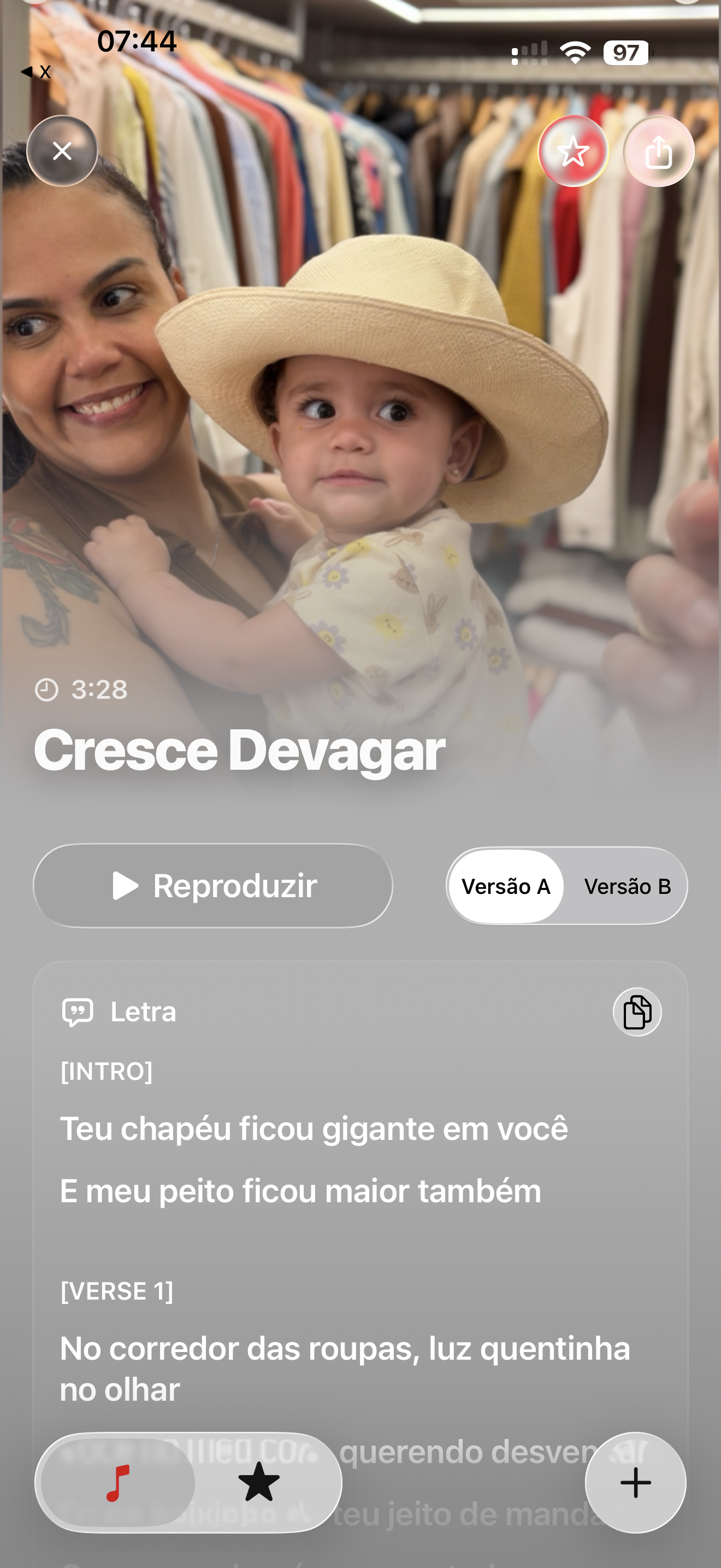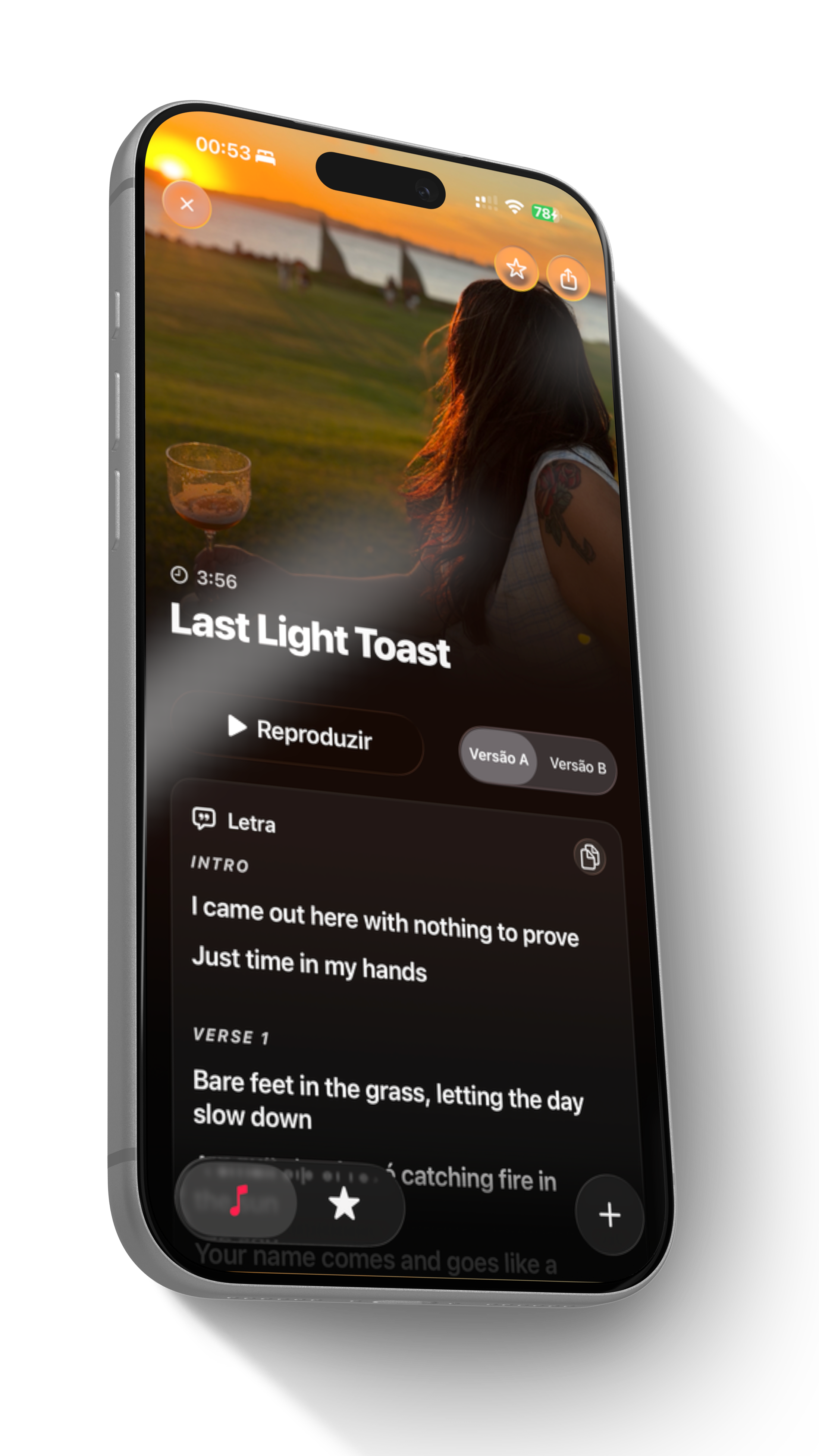 Songs and lyrics generated in English, Portuguese, Spanish, French, and German — auto-detected from your device language.