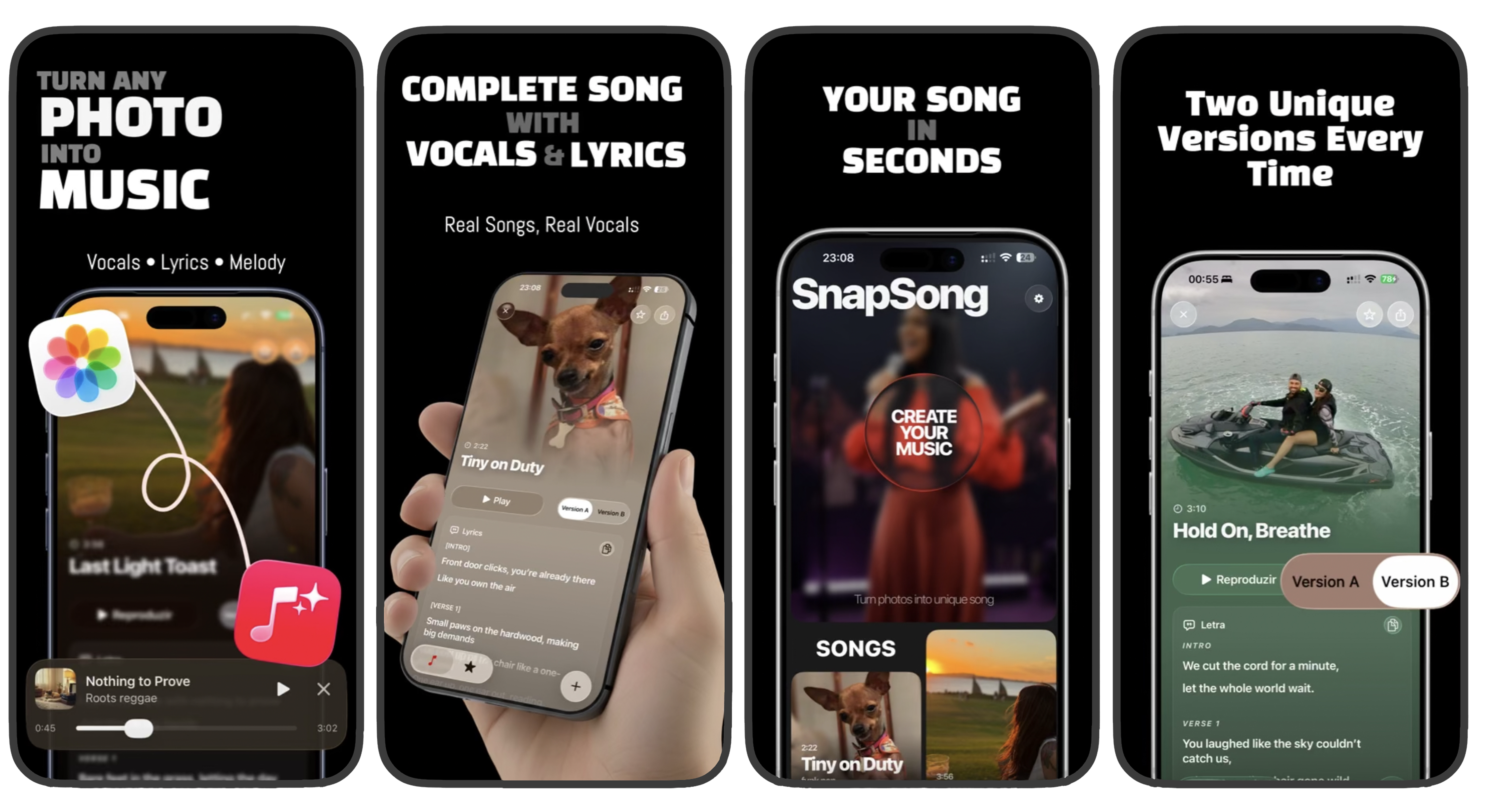 SnapSong is not a tool for musicians — it's for everyone. Your mom at a birthday party. Your friend on a road trip. A kid pointing the camera at their dog. Anyone can create and have their own song, fast and simple, without understanding anything about music. One photo, and they have a real song — with vocals, lyrics, and a melody that actually matches the moment.